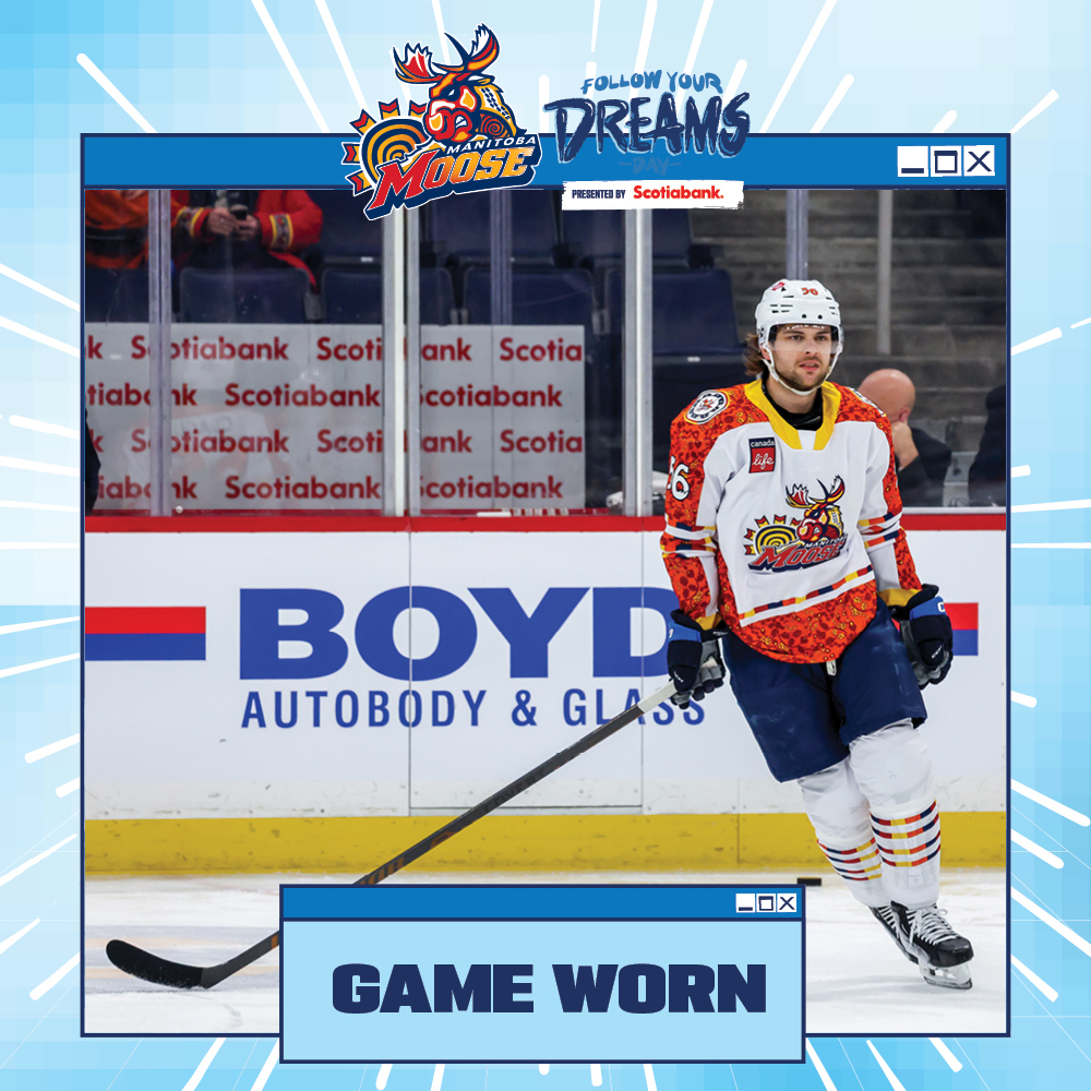 You are bidding on an authentic size 54 Manitoba Moose Follow Your Dreams Jersey. This unique Follow Your Dreams jersey was game worn on January 25, 2026, when the Manitoba Moose took on Grand Rapids Griffins. All proceeds from the auction will benefit Winnipeg Aboriginal Sports Achievement Center. All winning bidders will receive an Official Manitoba Moose Hockey Club Certificate of Authenticity and will have the option to have the player autograph their jersey at a date determined by the hockey club. Date and player availability to be determined. Local winners have the option to pick up this item.