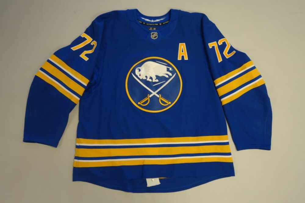 Tage Thompson 2025-26 Buffalo Sabres Set 1 Home Jersey - Worn for select games from October 9, 2025 through December 20, 2025. Size 58+. Includes a certificate of authenticity. Proceeds to benefit the Buffalo Sabres Foundation.