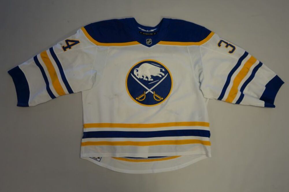 Alex Lyon 2025-26 Buffalo Sabres Set 1 Away Jersey - Worn for select games from October 11, 2025 through January 3, 2026. Size 58G. Includes a certificate of authenticity. Proceeds to benefit the Buffalo Sabres Foundation.