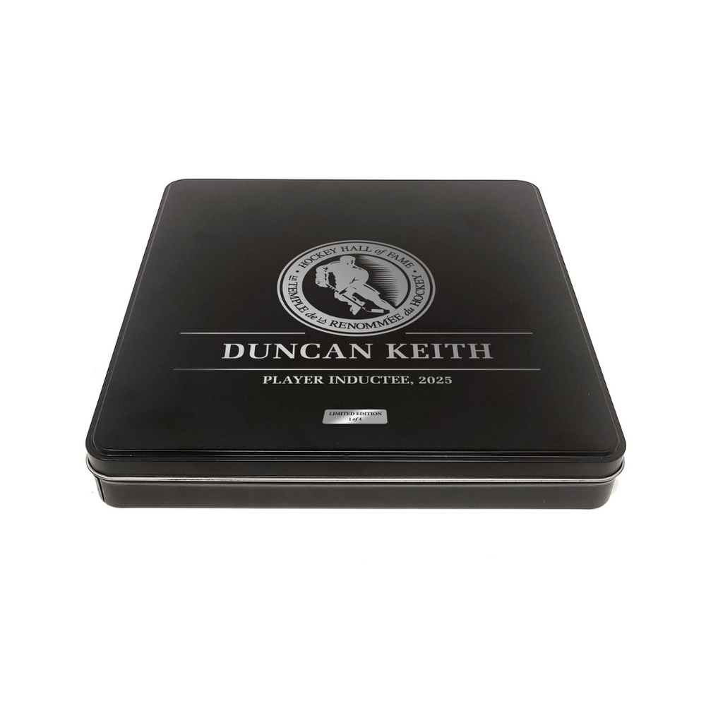 The Legends Line is an exciting collection of products sold by the Hockey Hall of Fame. This limited edition tin contains a set of pucks featuring Duncan Keith (Player Inductee, 2025). The three pucks include one that replicates an Honoured Member ring, one that commemorates the 2025 Induction Celebration, and one that features Duncan's Induction portrait, which is personally hand signed by Duncan himself. A small list of his major career accomplishments is also featured within the tin.