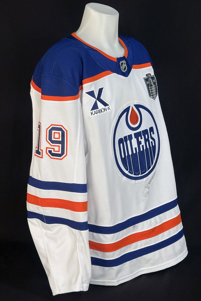 Welcome to the Edmonton Oilers Game Worn Jersey Program Online Auction! You are bidding on this Adam Henrique #19 - 2025 Stanley Cup Final Edmonton Oilers Game-Worn White Set #1 Jersey. The team wore this set of white road jerseys for Game #3 (June 9th, 2025) of the 2025 NHL Stanley Cup Finals vs the Florida Panthers. This Fanatics-made Oilers jersey features the 2025 Stanley Cup Finals patch on the left chest and a special uniform set tag sewn into the inside bottom hem that reads "Edmonton Oilers, 2025 Stanley Cup Final, White Set #1" along with the jersey # and name of the respective player the jersey was issued to. It also has the facsimile signature of Jeff Lang the team's Head Equipment Manager. In addition, there is an official Edmonton Oilers Game-Worn Jersey Inventory tag with serialized # sewn into the inside bottom left hem. Tagging inside the collar includes a Made in Canada Size 54 imprint. This particular jersey was worn by Oilers forward Adam Henrique and is crested with his #19 and surname on the back. As is to be expected, the game wear is very light overall considering the jersey was worn for only game three of the finals and was washed following the game. It will come exactly as worn and will not be autographed. In addition to the set tag certification mentioned above the jersey will come complete with a Letter of Authenticity from the Edmonton Oilers Hockey Club.