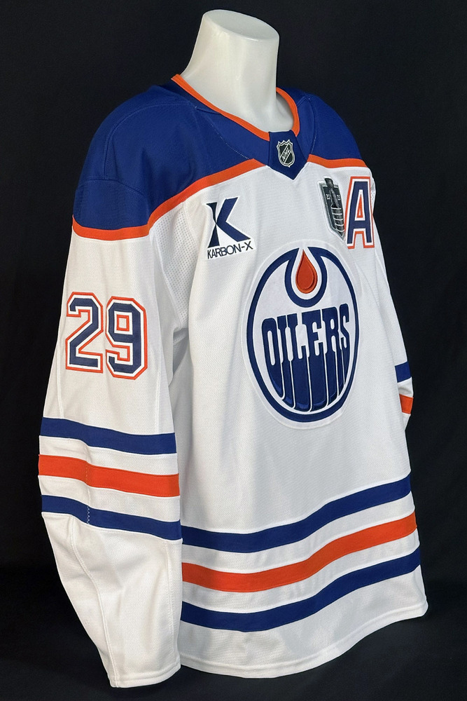 Welcome to the Edmonton Oilers Game Worn Jersey Program Online Auction! You are bidding on this Leon Draisaitl #29 - 2025 Stanley Cup Final Edmonton Oilers Game-Worn White Set #1 Jersey. The team wore this set of white road jerseys for Game #3 (June 9th, 2025) of the 2025 NHL Stanley Cup Finals vs the Florida Panthers however Draisaitl wears two jerseys per set one with the Assistant Captain's "A" and another without the letter. He wore this jersey with the "A" during Game #3 of the series. This Fanatics-made Oilers jersey features the 2025 Stanley Cup Finals patch on the left chest along and a special uniform set tag sewn into the inside bottom hem that reads "Edmonton Oilers, 2025 Stanley Cup Final, Royal Set #1" along with the jersey # and name of the respective player the jersey was issued to. It also has the facsimile signature of Jeff Lang the team's Head Equipment Manager. In addition, there is an official Edmonton Oilers Game-Worn Jersey Inventory tag with serialized # # sewn into the inside bottom left hem. Tagging inside the collar includes a Made in Canada Size 58 imprint. This particular jersey was worn by Oilers forward Leon Draisaitl and is crested with his #29 and surname on the back. As is to be expected, the game wear is very light overall considering the jersey was worn for only game three of the finals and was washed following the game. It will come exactly as worn and will not be autographed. In addition to the set tag certification mentioned above the jersey will come complete with a Letter of Authenticity from the Edmonton Oilers Hockey Club.