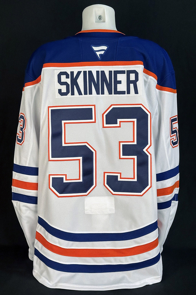 Welcome to the Edmonton Oilers Game Worn Jersey Program Online Auction! You are bidding on this Jeff Skinner #53 - 2025 Stanley Cup Final Edmonton Oilers Game-Worn White Set #1 Jersey. The team wore this set of white road jerseys for Game #3 (June 9th, 2025) of the 2025 NHL Stanley Cup Finals vs the Florida Panthers. This Fanatics-made Oilers jersey features the 2025 Stanley Cup Finals patch on the left chest and a special uniform set tag sewn into the inside bottom hem that reads "Edmonton Oilers, 2025 Stanley Cup Final, White Set #1" along with the jersey # and name of the respective player the jersey was issued to. It also has the facsimile signature of Jeff Lang the team's Head Equipment Manager. In addition, there is an official Edmonton Oilers Game-Worn Jersey Inventory tag with serialized # sewn into the inside bottom left hem. Tagging inside the collar includes a Made in Canada Size 56 imprint. This particular jersey was worn by Oilers forward Jeff Skinner for the Pre-game Warm Up only of the game (he was scratched from the line-up after) and is crested with his #53 and surname on the back. As is to be expected, there is no visible wear considering the jersey was worn for only the warm-up of game three of the finals and was washed following the game. It will come exactly as worn and will not be autographed. In addition to the set tag certification mentioned above the jersey will come complete with a Letter of Authenticity from the Edmonton Oilers Hockey Club.