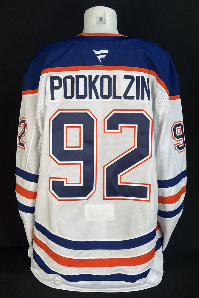 Welcome to the Edmonton Oilers Game Worn Jersey Program Online Auction! You are bidding on this Vasily Podkolzin #92 - 2025 Stanley Cup Final Edmonton Oilers Game-Worn White Set #1 Jersey. The team wore this set of white road jerseys for Game #3 (June 9th, 2025) of the 2025 NHL Stanley Cup Finals vs the Florida Panthers. This Fanatics-made Oilers jersey features the 2025 Stanley Cup Finals patch on the left chest and a special uniform set tag sewn into the inside bottom hem that reads "Edmonton Oilers, 2025 Stanley Cup Final, White Set #1" along with the jersey # and name of the respective player the jersey was issued to. It also has the facsimile signature of Jeff Lang the team's Head Equipment Manager. In addition, there is an official Edmonton Oilers Game-Worn Jersey Inventory tag with serialized # sewn into the inside bottom left hem. Tagging inside the collar includes a Made in Canada Size 58 imprint. This particular jersey was worn by Oilers forward Vasily Podkolzin and is crested with his #92 and surname on the back. As is to be expected, the game wear is very light overall considering the jersey was worn for only game three of the finals and was washed following the game. It will come exactly as worn and will not be autographed. In addition to the set tag certification mentioned above the jersey will come complete with a Letter of Authenticity from the Edmonton Oilers Hockey Club.