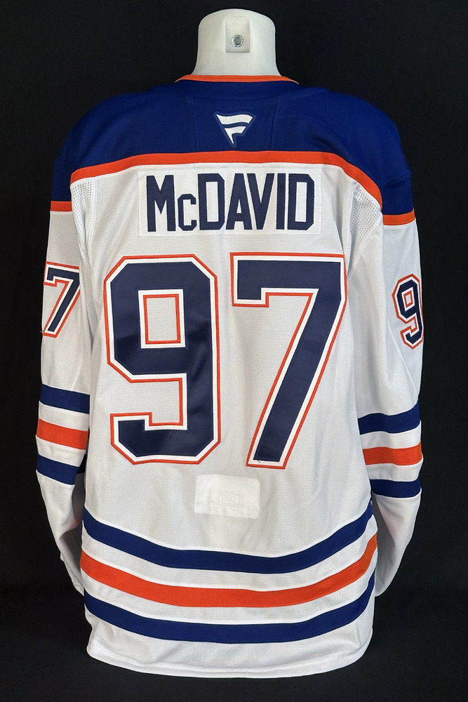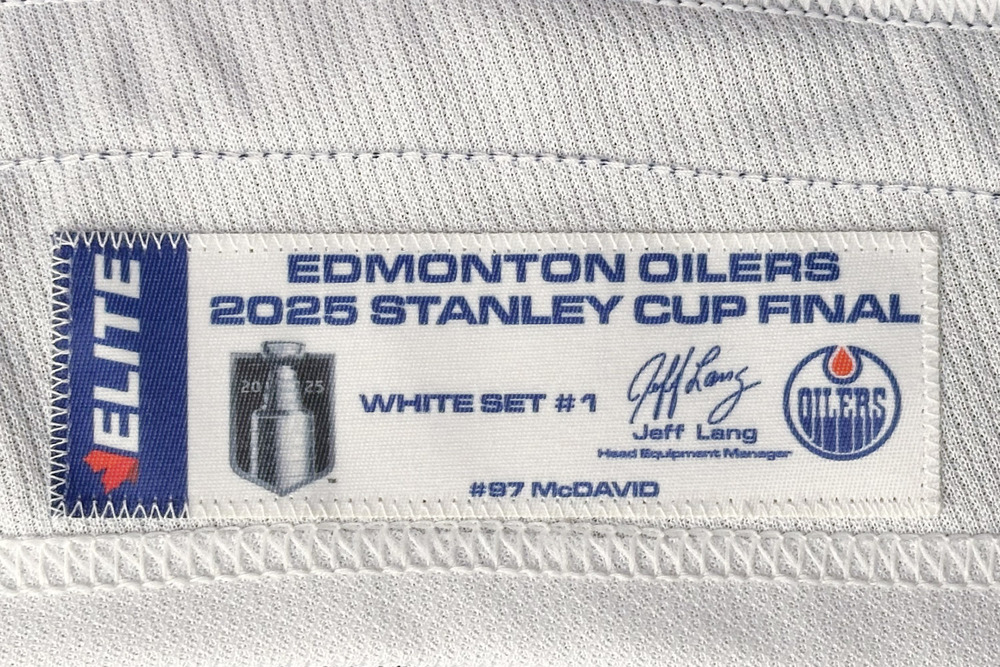 Welcome to the Edmonton Oilers Game Worn Jersey Program Online Auction! You are bidding on this Connor McDavid #97 - 2025 Stanley Cup Final Edmonton Oilers Game-Worn White Set #1 Jersey. The team wore this set of white road jerseys for Game #3 (June 9th, 2025) of the 2025 NHL Stanley Cup Finals vs the Florida Panthers. This Fanatics-made Oilers jersey features the 2025 Stanley Cup Finals patch on the left chest and a special uniform set tag sewn into the inside bottom hem that reads "Edmonton Oilers, 2025 Stanley Cup Final, White Set #1" along with the jersey # and name of the respective player the jersey was issued to. It also has the facsimile signature of Jeff Lang the team's Head Equipment Manager. In addition, there is an official Edmonton Oilers Game-Worn Jersey Inventory tag with serialized # sewn into the inside bottom left hem. Tagging inside the collar includes a Made in Canada Size 56 imprint. This particular jersey was worn by Oilers forward and team captain Connor McDavid and is crested with his #97 and surname on the back. As is to be expected, the game wear is very light overall considering the jersey was worn for only game three of the finals and was washed following the game. It will come exactly as worn and will not be autographed. In addition to the set tag certification mentioned above the jersey will come complete with a Letter of Authenticity from the Edmonton Oilers Hockey Club.