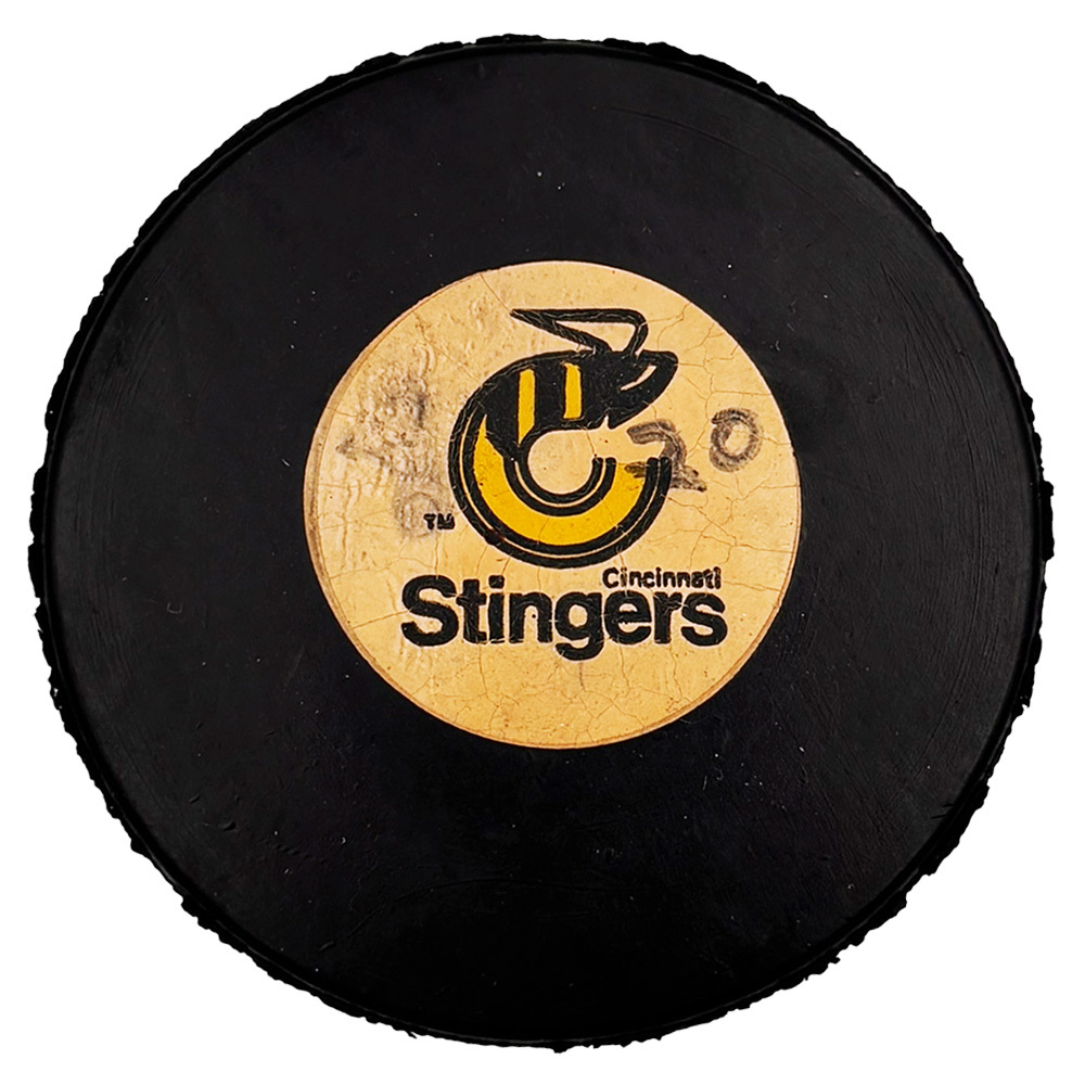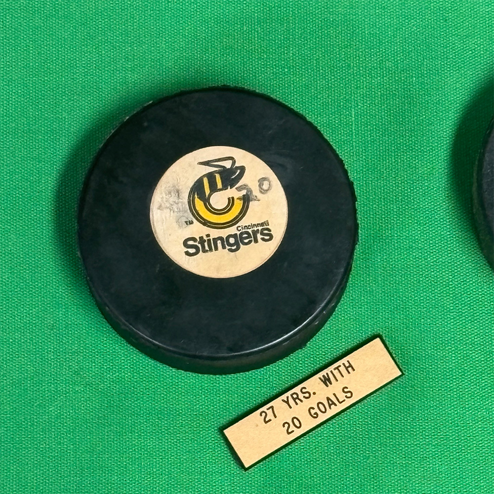 This Cincinnati Stingers puck was put in the back of net by Gordie Howe during the 1977-78 season for his 20th goal of the campaign. The puck marked 27 professional seasons in a row for Gordie with at least 20 goals or more, a record that may never be broken. It was also Gordie's last 20+ goal season, finishing with 34 at the young age of 50 playing for the New England Whalers. The puck displays the Stingers logo on the front with the number "20" written by a trainer to commemorate the accomplishment. It was on display at the Hockey Hall of Fame for a 3-year period in a framed display with other Gordie milestone pucks. The nameplate pictured is from that frame and comes with the puck.