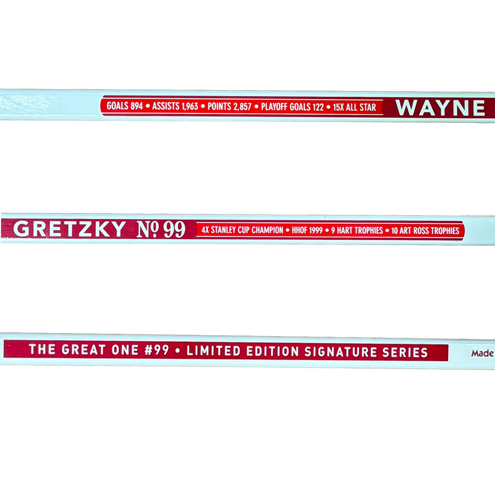 Bid on this commemorative hockey stick signed by "The Great One" himself - Wayne Gretzky. Gretzky remains the NHL's all-time leader with 2,857 career points, a record that may never be broken. This "Limited Edition Signature Series" stick features Gretzky's career achievements along the shaft and a bold autograph on the blade. A perfect display piece for your collection.