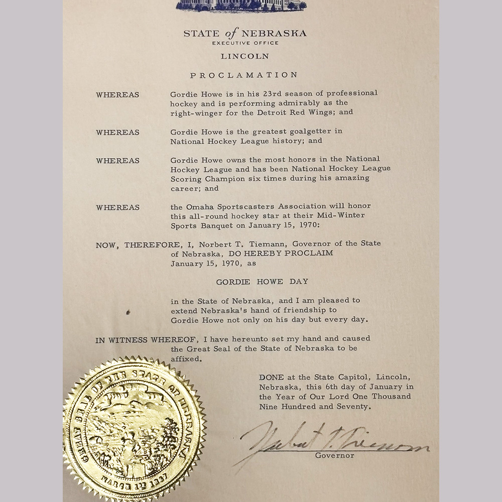 This framed proclamation comes from the personal collection of Mr. Hockey himself - Gordie Howe. It was issued in 1970 by the State of Nebraska in conjunction with the Omaha Sportscasters Association honoring Gordie Howe and proclaiming "Gordie Howe Day" on January 15, 1970. It measures approximately 12.5X16.5" in size.