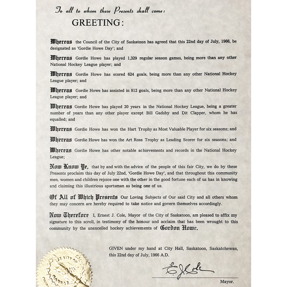 City of Saskatoon 1966 'Gordie Howe Day' Framed Proclamation