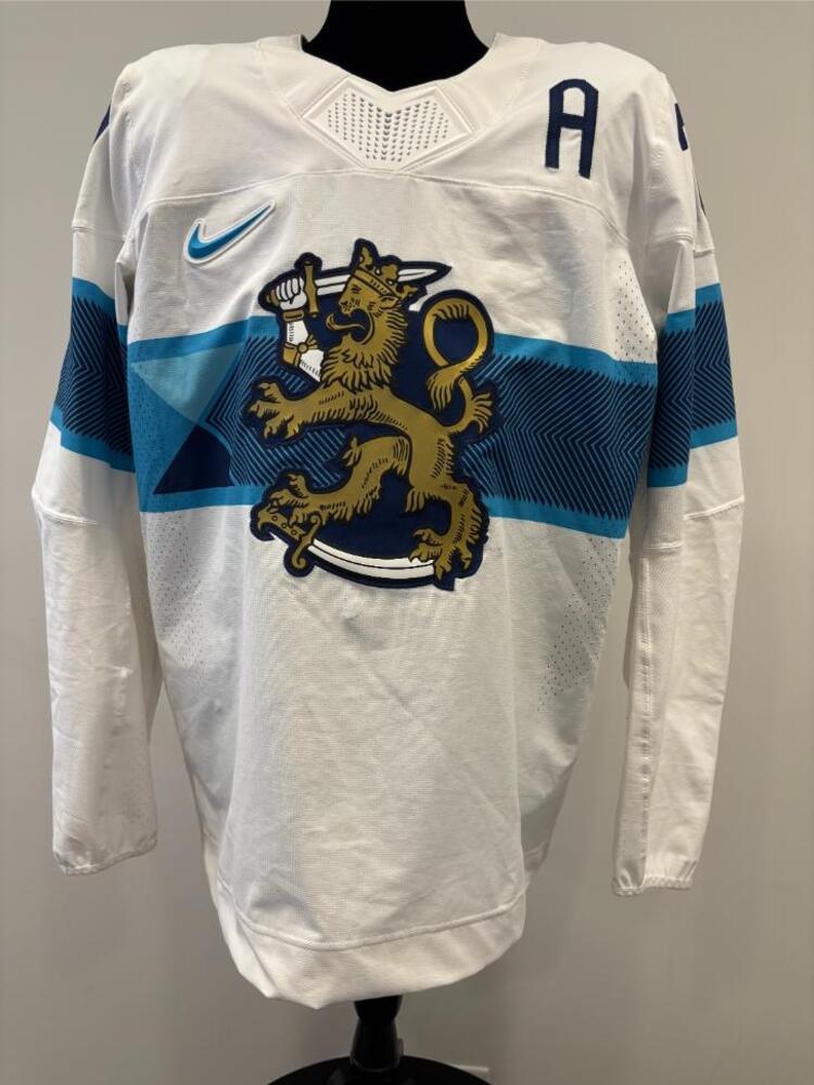 Jersey was worn by Finland Men's Olympic Ice Hockey Team Player Sebastian Aho during Finland's Preliminary round game against Slovakia on February 11, 2026 as a part of the 2026 Milano Cortina Winter Games in Milan, Italy. This item was collected on-site in Milan on behalf of the NHLPA and National Hockey League.
