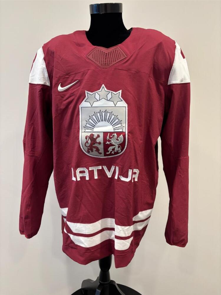 Teodors Bļugers Latvia Game-Used Red Jersey worn v. USA on February 12, 2026, as a part of the 2026 Milano Cortina Winter Games.