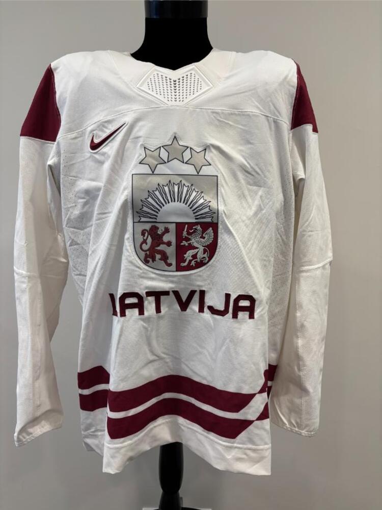 Dans Locmelis Latvia Game-Used White Jersey worn v. Denmark on February 15, 2026, as a part of the 2026 Milano Cortina Winter Games.