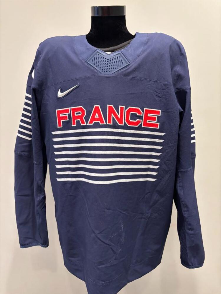 Jersey was worn by France Men's Olympic Ice Hockey Team Player Alexandre Texier during France's preliminary round game against Germany on February 17, 2026 as a part of the 2026 Milano Cortina Winter Games in Milan, Italy. This item was collected on-site in Milan on behalf of the NHLPA and National Hockey League.