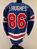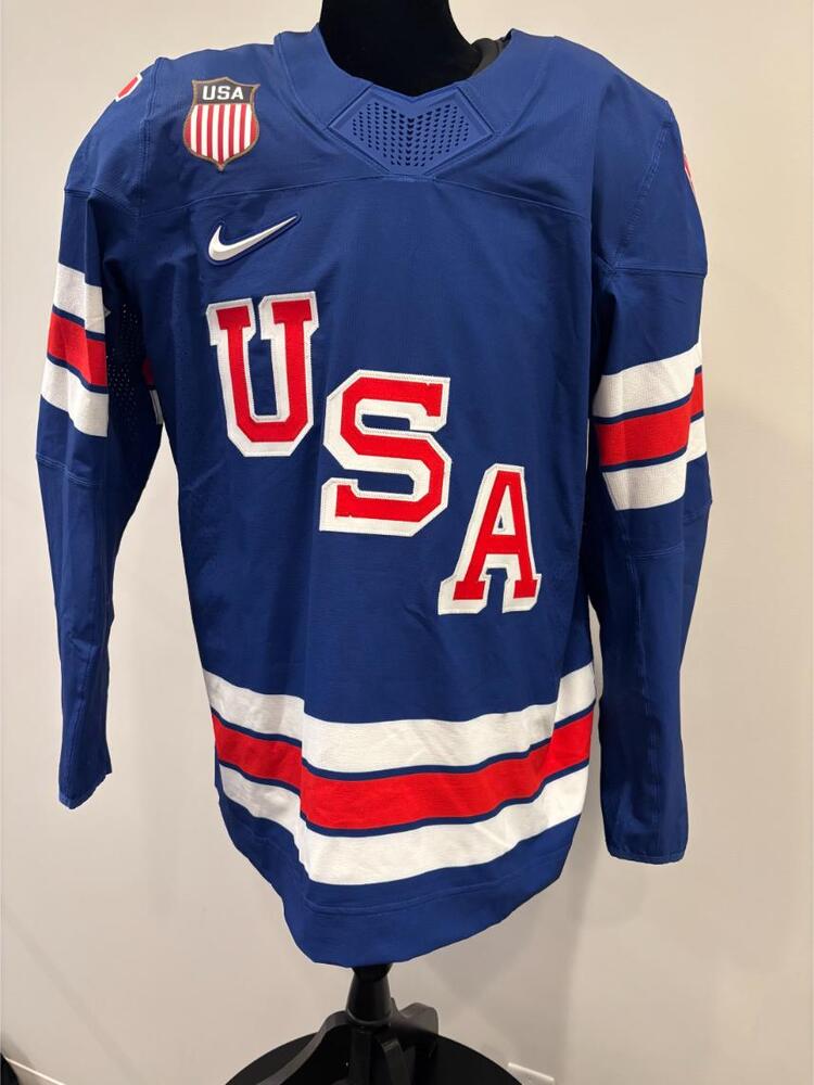Jack Hughes USA Game-Used Blue Jersey worn v. Denmark on February 14, 2026, as a part of the 2026 Milano Cortina Winter Games.