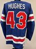 Quinn Hughes USA Game-Used Blue Jersey worn v. Denmark on February 14, 2026, as a part of the 2026 Milano Cortina Winter Games.