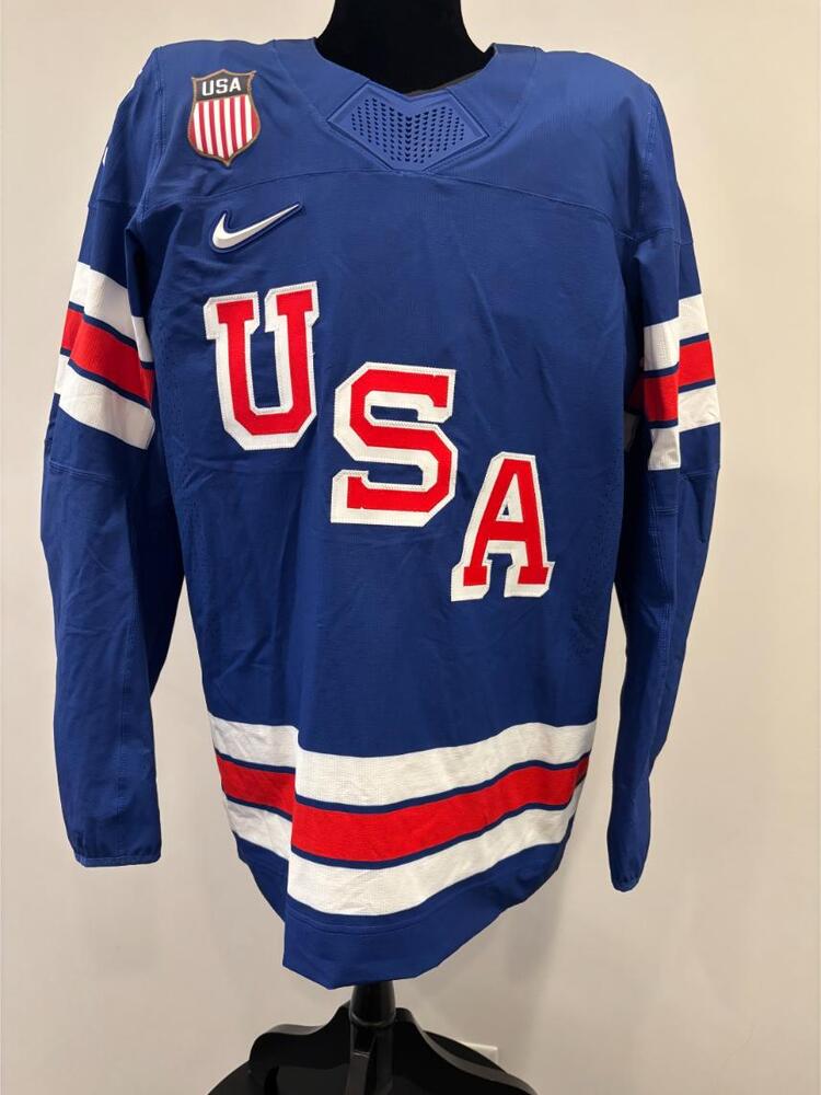 Jersey was worn by USA Men's Olympic Ice Hockey Team Player Quinn Hughes during the Unites States preliminary round 6-3 victory over Denmark on February 14, 2026 as a part of the 2026 Milano Cortina Winter Games in Milan, Italy. This item was collected on-site in Milan on behalf of the NHLPA and National Hockey League.