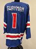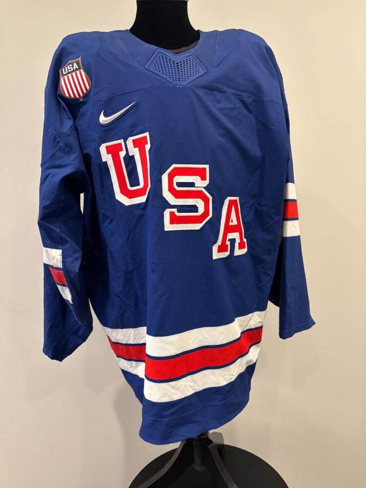 Jeremy Swayman USA Game-Used Blue Jersey worn v. Denmark on February 14, 2026, as a part of the 2026 Milano Cortina Winter Games.