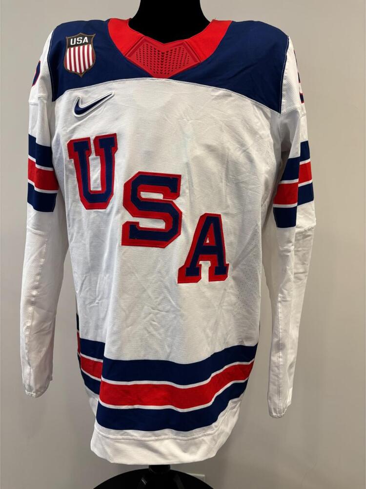 Jersey was worn by USA Men's Olympic Ice Hockey Team Player Jake Sanderson during the Unites States preliminary round 5-1 victory over Germany on February 15, 2026 as a part of the 2026 Milano Cortina Winter Games in Milan, Italy. This item was collected on-site in Milan on behalf of the NHLPA and National Hockey League.