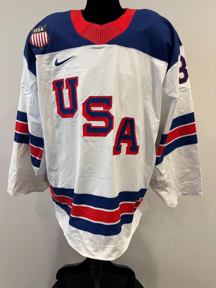 Jersey was worn by USA Men's Olympic Ice Hockey Team Player Connor Hellebuyck during the Unites States preliminary round 5-1 victory over Germany on February 15, 2026 as a part of the 2026 Milano Cortina Winter Games in Milan, Italy. This item was collected on-site in Milan on behalf of the NHLPA and National Hockey League.