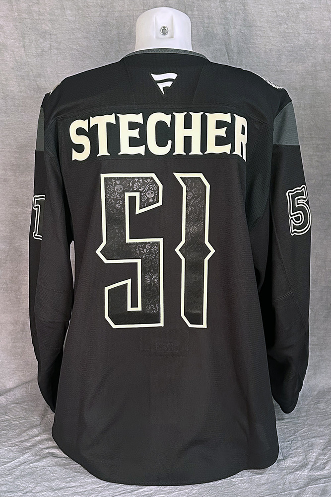 Welcome to the Edmonton Oilers Community Foundation 2026 Online Charity Auction! Show your support for the Foundation and the great charitable initiatives they undertake in Oil Country by bidding on this Troy Stecher #51 - Autographed 2025-26 Edmonton Oilers Dia de los Muertos (Day of the Dead) Ltd Edition Fanatics Practice Jersey (Autographed Only / Not Worn). The Edmonton Oilers held their annual Dia de los Muertos (Day of the Dead) game on Saturday, November 1, 2025 when the team hosted the Chicago Blackhawks at Rogers Place. With the Oilers Dia de los Muertos logos and design elements on full display throughout the arena, this cultural celebration included vibrant pageantry paying tribute to this unique holiday. Although NHL teams are no longer permitted to wear cause or celebration based jerseys during the pre-game warm up a complete set of these special jerseys were made to commemorate the occasion. They were then autographed by the players with the purposes of auctioning off all in support of charity! These Fanatics made pro quality black with white trim practice jerseys with fight strap were customized with the very special Edmonton Oilers Dia de los Muertos logo and design elements. The logos were designed by Cristoval Castillon, Design Lead, OEG Sports & Entertainment. "I've always wanted to bring a little bit of Mexican representation to the Oilers and with our Dia de los Muertos game, I found an opportunity to highlight aspects of the traditional holiday such as the calaca - the skeletal figure featured on the main crest of the Oilers Dia de los Muertos jersey - most popular in modern Day of the Dead costumes and decorations," Castillon said. "The main crest is flanked on the left shoulder of the jersey by our friend Hunter the Lynx, who adorns a quetzal feathered headdress once worn by those in high power, along with their deities, within ancient Aztec civilization. The 'Petroleros' logo sits upon the right shoulder adorned with bright sunflowers and marigolds which are highly symbolic of Mexico. On the back of the jersey the respective player's surname is displayed in blue letters on a matching white name bar. Their respective jersey number is also displayed on the back and sleeves in the colorful matching number pattern. This particular jersey is a size 56 and is indicated as such in the collar. Last but not least the jersey has been nicely autographed in silver paint marker on the back number by Troy Stecher! Please note this is an actual NHL practice-weight on-ice authentic jersey (NOT PLAYER WORN) with all lettering, numbering and crests professionally stitched onto the jersey. The jersey will come complete with a Letter of Authenticity from the Edmonton Oilers Hockey Club and official Edmonton Oilers 2025-2026 Season "DIA DE LOS MUERTOS NIGHT, Autographed Jersey Set" Tag including their # and surname sewn into the inside bottom hem of the jersey.
