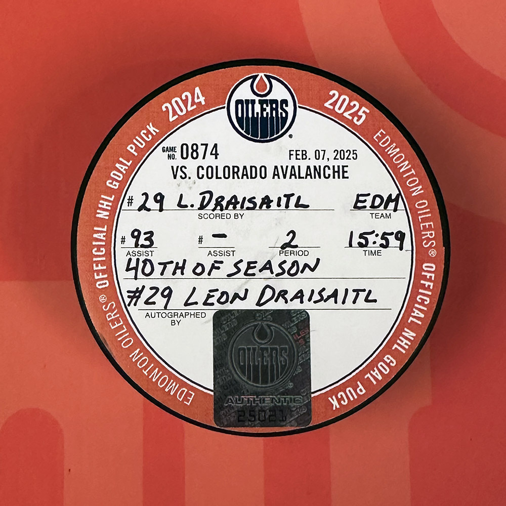 Leon Draisaitl #29 - Autographed Edmonton Oilers Goal Puck From Feb 7, 2025 Vs Colorado Avalanche (40th Goal Of 2024-25 Season)