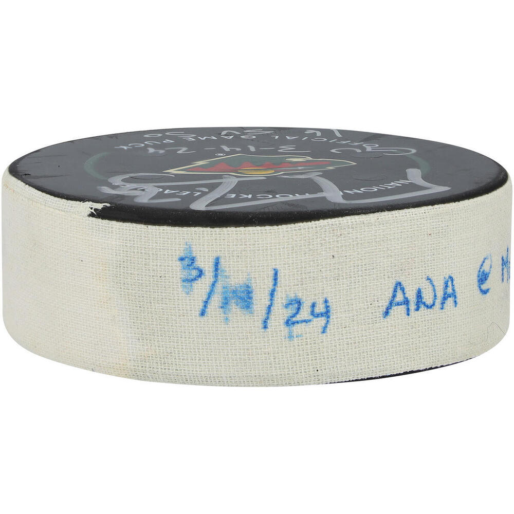 Marc-Andre Fleury Minnesota Wild Autographed Game-Used Puck vs. Anaheim Ducks on March 14, 2024 with Multiple Inscriptions