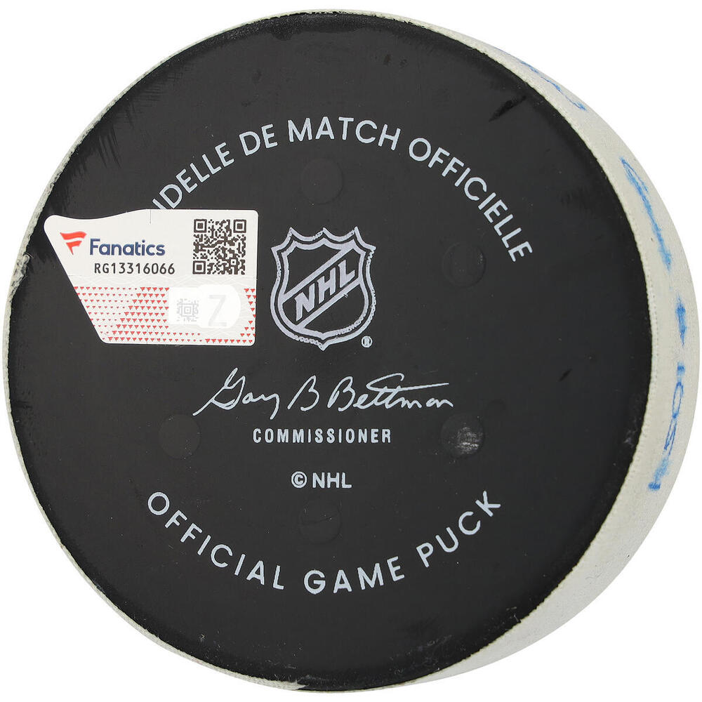Own this Marc-Andre Fleury autographed game-used puck from the March 14, 2024 game against the Anaheim Ducks. This puck was collected by Fanatics Authentic in conjunction with the NHL and comes with an individually numbered, tamper-evident hologram. To ensure authenticity, the hologram can be verified online. This process helps to ensure that the product purchased is authentic and eliminates any possibility of duplication or fraud. Please note: This item is game-used and sold in "as-is" condition.