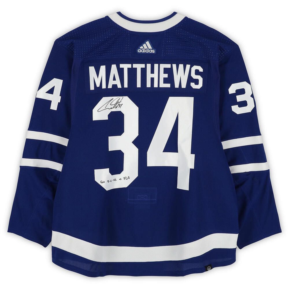 Own this Auston Matthews autographed game-used jersey from the May 2, 2023 game against the Florida Panthers. This puck was collected by Fanatics Authentic in conjunction with the NHL and comes with an individually numbered, tamper-evident hologram. To ensure authenticity, the hologram can be verified online. This process helps to ensure that the product purchased is authentic and eliminates any possibility of duplication or fraud. Please note: This item is game-used and sold in "as-is" condition.