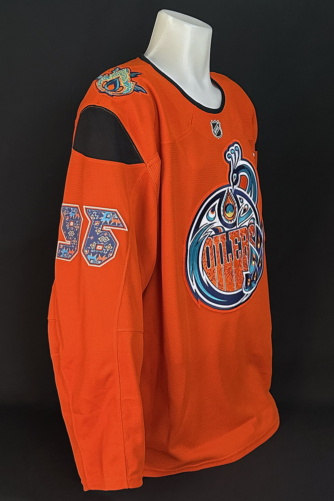 Welcome to the Edmonton Oilers Community Foundation 2026 Online Charity Auction! Show your support for the Foundation and the great charitable initiatives they undertake in Oil Country by bidding on this Jake Walman #96 - Autographed 2025-26 Edmonton Oilers South Asian Celebration Night Ltd Edition Fanatics Practice Jersey (Autographed Only / Not Worn). The Edmonton Oilers held their third annual South Asian Celebration Night on Thursday January 29th, 2026 when the club hosted the San Jose Sharks at Rogers Place. During this game the team honoured the vibrant and diverse culture of South Asian communities across Oil Country. Although NHL teams are no longer permitted to wear cause or celebration based jerseys during the pre-game warm up a complete set of these special jerseys were made to commemorate the occasion. They were then autographed by the players with the purposes of auctioning off all in support of charity! These Fanatics made pro quality orange practice jerseys with fight strap were customized with a very special Edmonton Oilers logo. The team partnered with local designers Sunny Nerval and JC Lutao to create the Oilers South Asian Celebration specialty logo. "Incorporating the peacock into the Oilers logo captures the essence of South Asian heritage, resonating with themes of unity, diversity and community spirit," Nerval said. "The peacock's plumage, with its eye-catching array of colours, mirrors the diversity within the South Asian community and by extension, the fanbase of the Edmonton Oilers. It reflects the blend of different languages, religions and cultures that South Asians bring to the cultural mosaic of Edmonton." On the back of the jersey the respective player's surname is displayed in three color pro-twill letters on a matching orange name bar. Their respective jersey number is also displayed on the back and sleeves in a colorful South Asian inspired number pattern. This particular jersey is a size 56 and is indicated as such in the collar. Last but not least the jersey has been nicely autographed in black paint marker on the back number by Jake Walman! Please note this is an actual NHL practice-weight on-ice authentic jersey (NOT PLAYER WORN) with all lettering, numbering and crests professionally stitched onto the jersey. The jersey will come complete with a Letter of Authenticity from the Edmonton Oilers Hockey Club and official Edmonton Oilers 2025-2026 Season "South Asian Celebration Night, Autographed Jersey Set, (Team Issue Only / Not Worn)" Tag including their # and surname sewn into the inside bottom hem of the jersey.