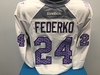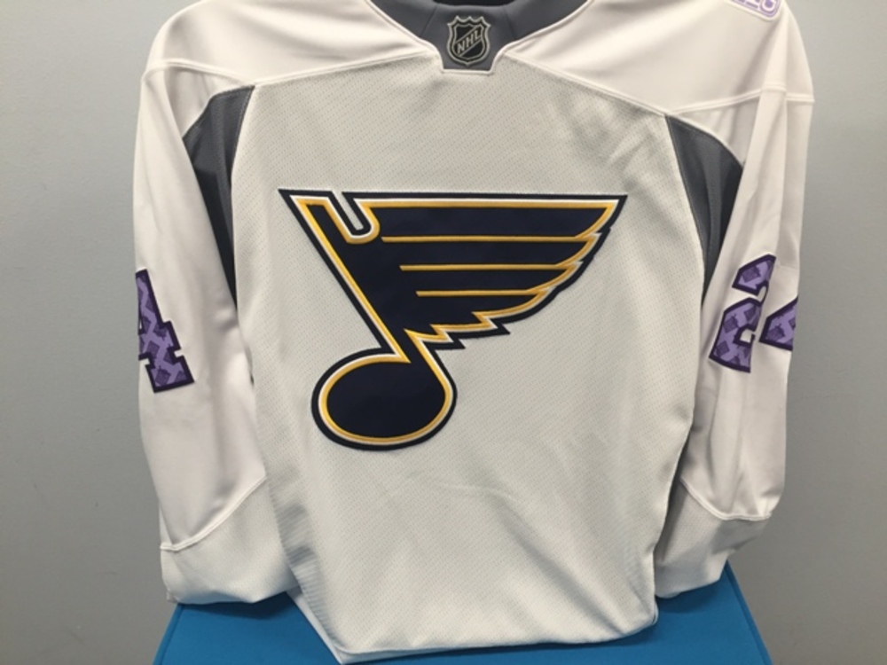 Bid on this Bernie Federko Hockey Fights Cancer themed Blues warm-up jersey. This jersey was issued on October 24, 2015 and is an official jersey including a tie-down strap. The jersey features a navy Blue Note on the front, lavender numbering and lettering on the back and the Blues Hockey Fights Cancer logo on each shoulder. Includes certificate of authenticity. Jersey will be autographed on the numbers prior to shipping. Jersey Size 56. Official jersey including a tie-down strap.